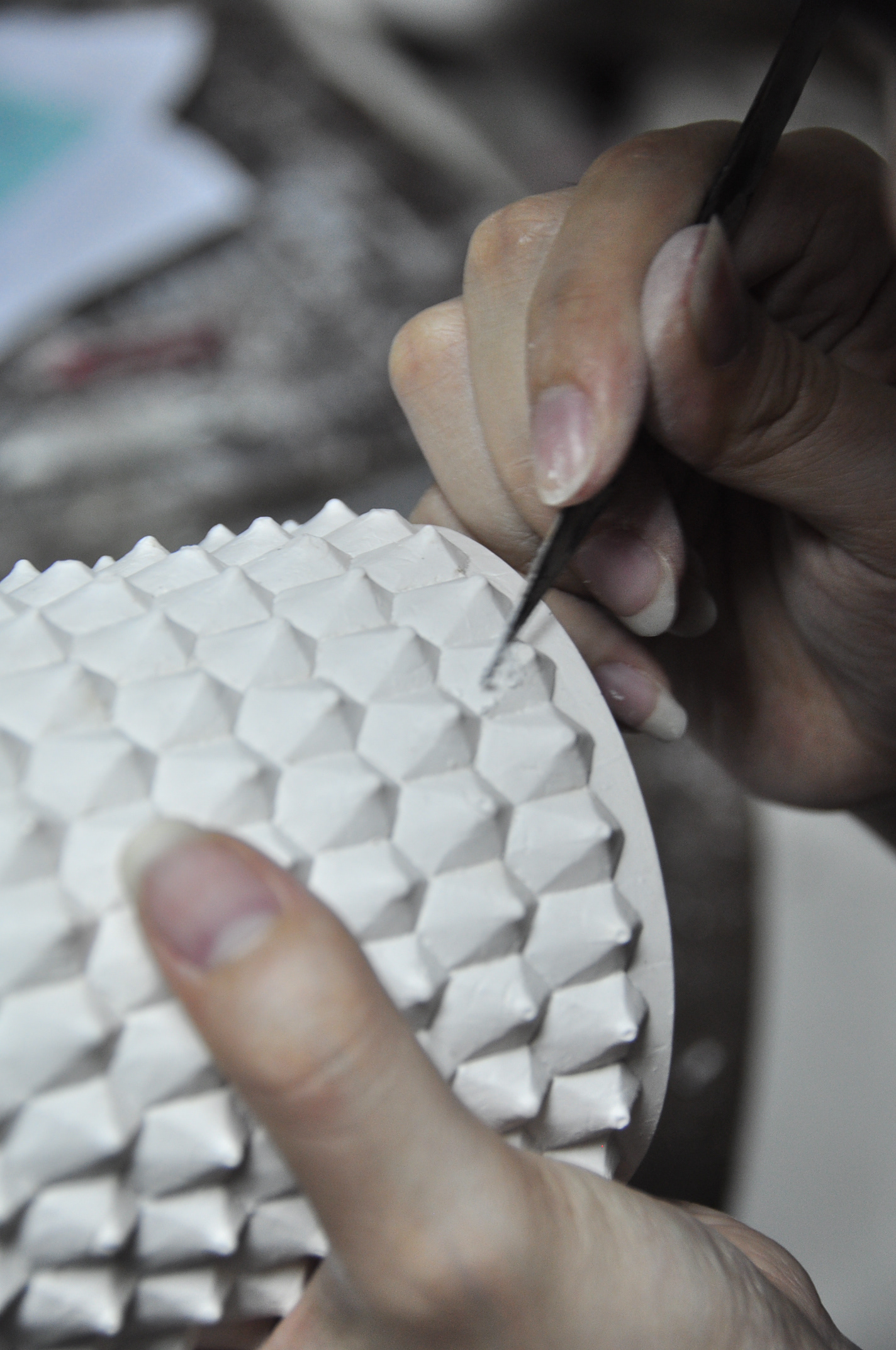 The action of eating sweet potato is the origin of design for hand feeling conversion. It is observed that people would use the peels of sweet potato or fruits as “utensils” as eating them. This filling and hand handling concept is converted to the design of pottery cup. The local vegetables and fruits selected are separated by the arrangements and features of peel texture and six textures of fruits and vegetables are placed on the cup with the same specification. In addition to the visual affection to the looks of cups, the thought in memory will be reinforced as touching the cup. The self-experiencing is indispensable for people pursuing lifestyle in this modern world with abundant supply of materials. This product begins with the idea of life-experiencing. A user, either an adult or a child, will have interaction with and co-learning from this product. It is an interaction and educational process through which a user understands the body of cup and the texture of fruit or vegetable peel. We intend to keep the particularities of outer and inner surfaces. Furthermore, the space between these two surfaces is empty. That is, a user will not worry about being scalded when his or her hands direct contact the cup with hot drink within.